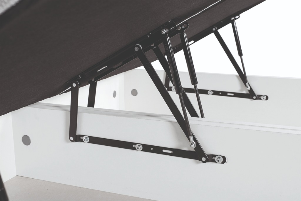 Tapa tejido 3D para la ventilación y aireación óptima del colchón, compuesta por 4 travesaños de acero 40x30 mm. Fondo tablero grosor 16 mm atornillado con capacidad de soportar peso. Patas madera maciza de haya. Pistones accionados por medio de gas. La tapa se desliza hacia delante al accionar su apertura, lo que impide roces con el cabecero. Tapa enmarcada con polipiel o tela.