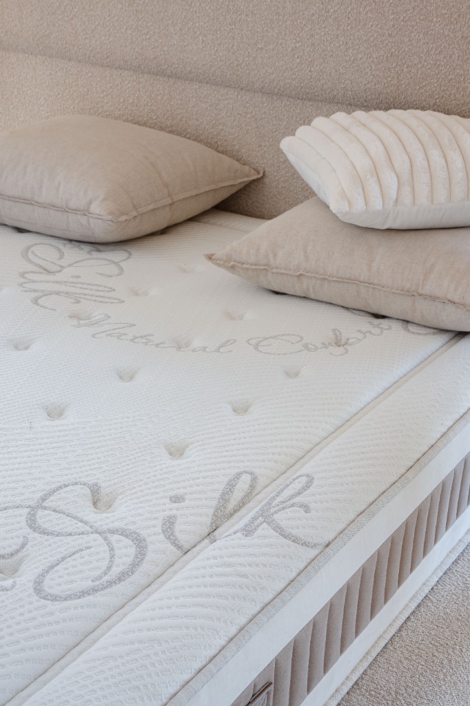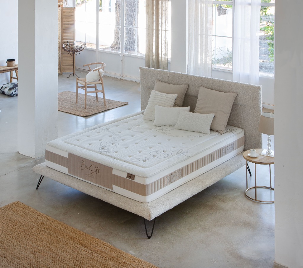 Biosilk: Descanso reparador. Fabricado con materiales naturales como seda y fibra de algodón, junto a la tecnología Breeze, ideales para regular el calor y exceso de humedad. Apto para todo tipo de pesos gracias al único HR Hyperflex 42kg y viscoelástica de 80KG.
