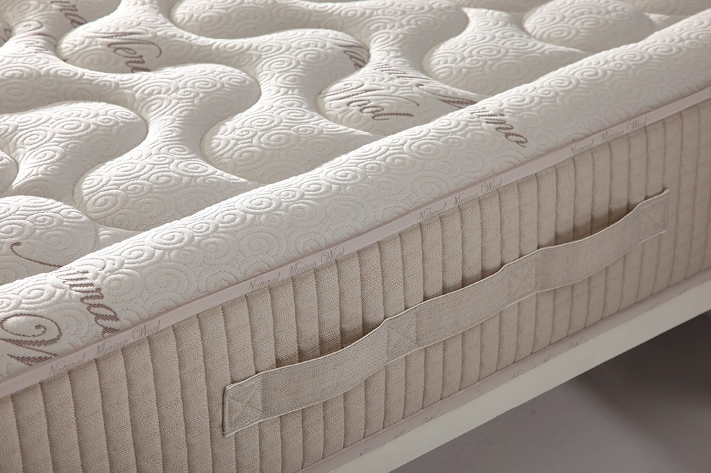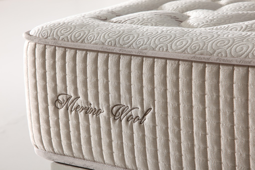 Merino: comodidad excepcional. Gracias a su núcleo perfilado de 7 zonas y a la viscoelástica Bio Memory de soja podemos decir que es el confort elevado a su máxima expresión. Independencia de lechos. Lana natural de Merino que aporta la regulación óptima de calor y humedad.